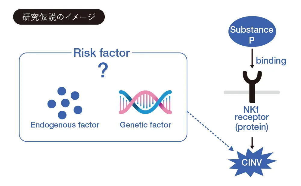 横川准教授らは、CINVが重症化しやすい若年女性に着目し、その背景にある生物学的・遺伝学的因子を解明しようとしている。「研究仮説として、エストロゲンのような女性特有の内因性ホルモンと特定の遺伝子多型の影響を考えています。それらが、神経ペプチドであるサブスタンスPとその受容体を介して、嘔吐中枢刺激経路の感受性を亢進すると推測しています」と語る。