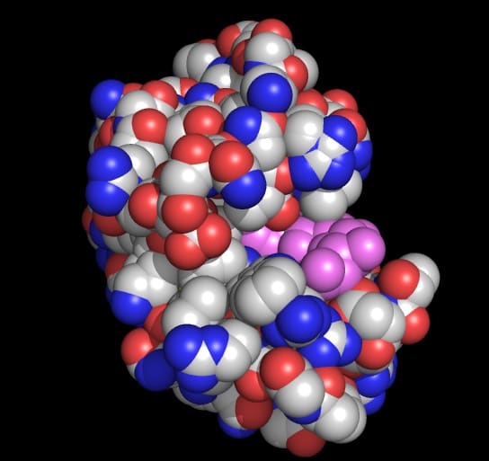 タンパク質の構造は、タンパク質の種類ごとに決まっている。例えば、上の図はリゾチームという名前のタンパク質の構造である。この図で、原子が適当に積み重なっている様に見えるかもしれないが、そうではない。タンパク質ごとに、厳密にこの積み重なりかたが決まっている。例えば、タマゴの卵白1g中に1013分子のリゾチームがあるが、そのすべてのリゾチーム分子は上図の様な構造をしている。